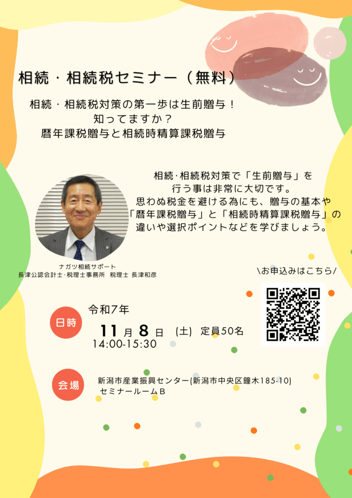 カテゴリー: お知らせこの度、下記の日程で新潟日報カルチャースクール・長岡教室で有料の「遺産相続のやさしい基礎講座」(全3回)を開催する事になりました。参加者の皆様に有用な相続及び贈与税の知識を学んで頂ければ幸いです。興味のある方のご参加をお待ちしています。